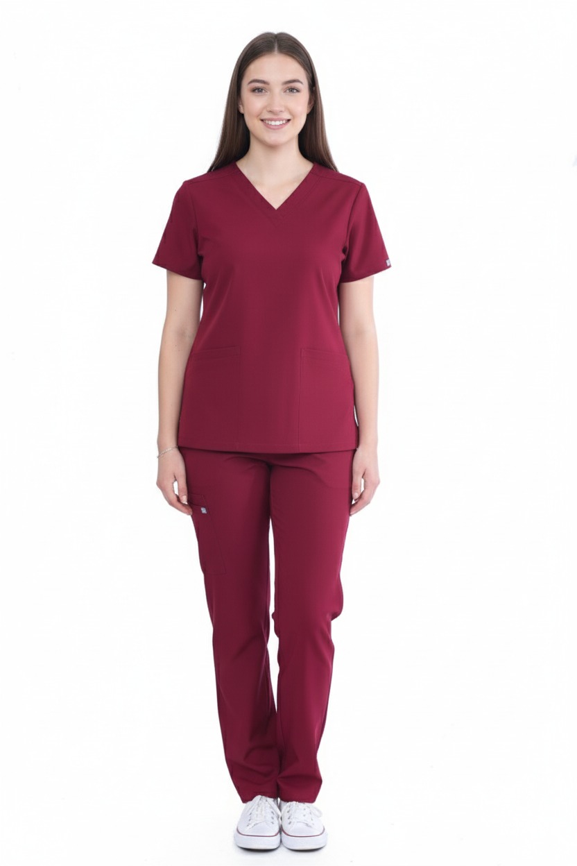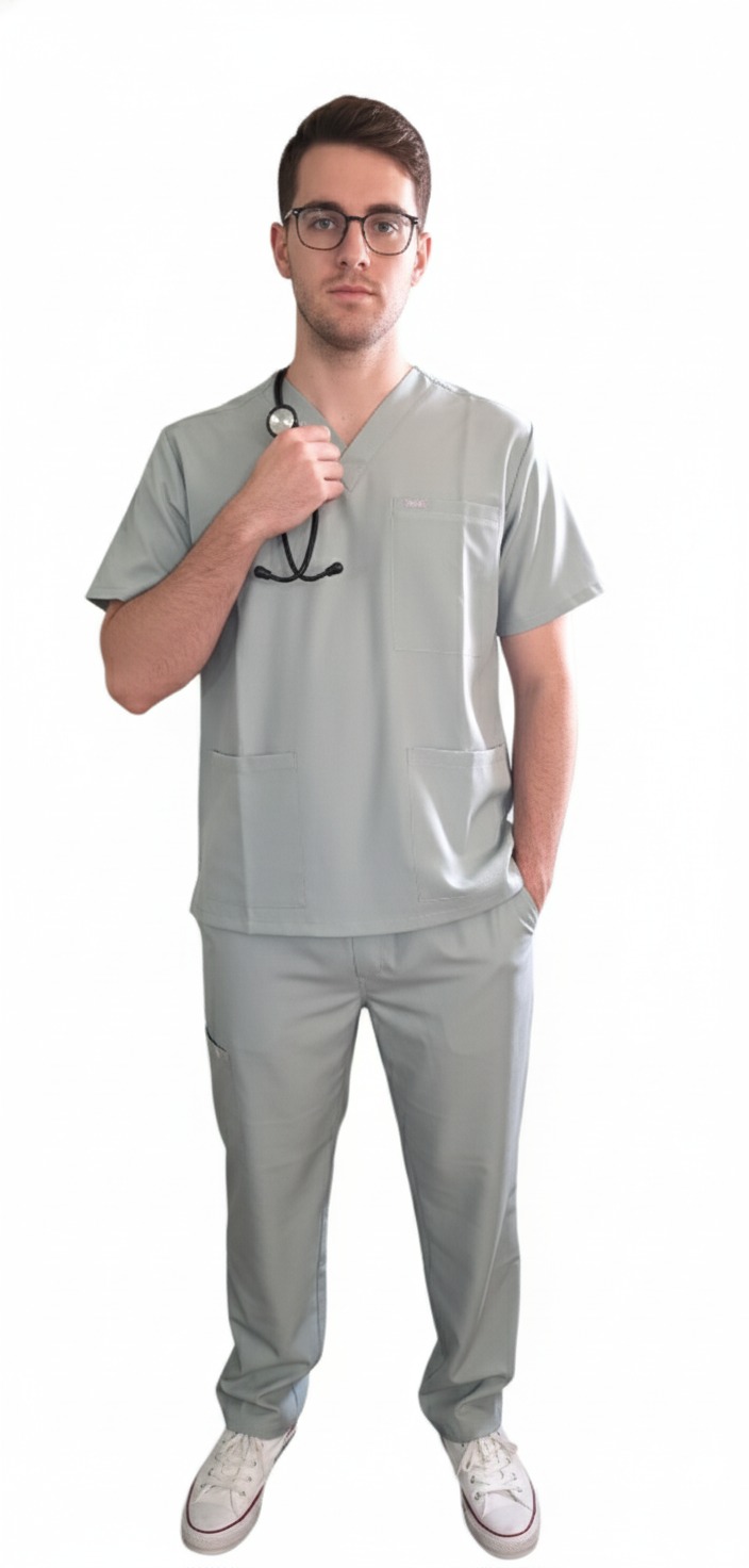 Material Specifications: 90% polyester, 10% spandex. 104 gsm lighter, antimicrobial, and fluid-resistant, wrinkle-free, 3 pockets on top and 6 pockets on pants, inward waist rope, and real Canadian.